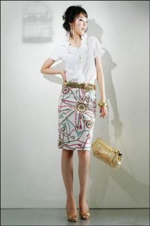 亮點:金色腰帶,時尚提包,帶精致花紋的西裝裙。