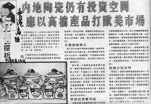 強又稱,中國陶瓷若要與國外競爭,還需不斷創(chuàng)新款式,在生產管理線上作好,不論是人力、廠房、設備方面。另外,建立廣泛銷售網也是加強競爭的方法。至於中國陶瓷現(xiàn)於東南亞的發(fā)展,張則說,由於東南亞受金融風暴影響,市場銷費力受到阻礙,若在現(xiàn)時想發(fā)展這市場,都是以推出實用陶瓷用品為佳,如陶瓷餐具就是很好的項目。