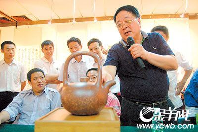 上圖:專(zhuān)家正在評(píng)點(diǎn)紫砂壺
