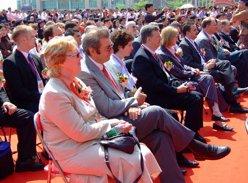 4月18日上午,和風(fēng)麗日。30多名來自德國、意大利等國家的歐洲客商走出華夏新中源大酒店,結(jié)伴朝佛山國際會展中心走去。此時,佛山國際會展中心已是彩球飄揚(yáng),雄獅勁舞。第九屆佛山(國際)陶瓷博覽交易會開幕式會場商客云集,德國拓歐集團(tuán)、佛亞展覽(香港)有限公司總裁托馬斯、中國陶瓷工業(yè)協(xié)會理事長楊自鵬、佛山市副市長李子甫、中國建筑衛(wèi)生陶瓷協(xié)會會長丁衛(wèi)東、禪城區(qū)副區(qū)長梁炳軍、佛山市陶瓷行業(yè)協(xié)會秘書長尹虹等有關(guān)領(lǐng)導(dǎo)及葉德林、何新明、黃建平、張孟友等一批中國建陶巨頭掌門人于主席臺就坐。隨著蘇格蘭風(fēng)情樂隊(duì)的樂器演奏,第九屆佛山(國際)陶瓷博覽交易會在眾人的期盼中拉開了序幕。
