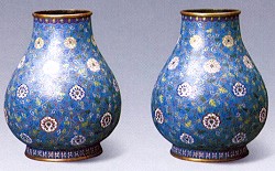 掐絲琺瑯器與鏨胎琺瑯器的表面效果相似,都給人一種似寶石鑲嵌的感覺(jué)。這其中的主要原因是,掐絲琺瑯器和塹胎琺瑯器二者在點(diǎn)藍(lán)(填施琺瑯釉)、焙燒、磨光和鍍金等工藝制作方法上基本是相同的。二者之間的根本區(qū)別在于金屬加工工藝的具體方法上,即圖案紋樣的起線(制作和形成)方法。掐絲琺瑯器是以細(xì)而薄的金屬絲或金屬片,焊著或者是粘合在金屬胎上組成圖案紋樣;而塹胎琺瑯器則是運(yùn)用金屬鏨刻技法起線花紋。因此,如果我們細(xì)心觀察這兩種琺瑯器,就會(huì)發(fā)現(xiàn),掐絲琺瑯器的圖案線條纖細(xì)而婉轉(zhuǎn),而且在掐絲、焊著及磨光的過(guò)程中,比較容易產(chǎn)生線條斷裂現(xiàn)象而塹胎琺瑯器的圖案線條一般比較粗壯,且無(wú)接頭相焊痕。