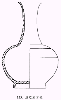 傳瓶 流行于隋唐時期的器形,即單口,雙腹并聯(lián)的雙縭尊,自銘"傳瓶".目前僅發(fā)現(xiàn)兩件,分別收藏于天津市藝術(shù)博物館和中國歷史博物館,后者出土于西安郊區(qū)隋大業(yè)四年(608年)李靜訓(xùn)墓.