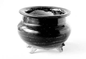 南宋吉州窯黑釉香爐高9厘米,直徑11厘米,爐口平沿外折,中腹微鼓,三只帶弓弧形矮足,露出胎體,底部為灰白色,上面有些粘貼得很緊的紅壤,雖經(jīng)沖刷但依舊保留著,可見此爐應(yīng)為出土之物了。爐身以黑釉為主色調(diào),黑釉施至底部,釉汁瑩潤(rùn),釉面光潔,器型規(guī)整,制作精細(xì),別具雅趣。內(nèi)胎不施釉,拉坯痕跡明顯,刀法簡(jiǎn)練,瓷土淘洗不夠精細(xì),可以看到一些雜質(zhì),胎體略顯得粗松一點(diǎn)。