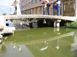 毛昌逵說(shuō):古時(shí)候,鰲江自蓋竹村前經(jīng)過(guò)。自鰲江上岸,走過(guò)虹橋,就進(jìn)入了蓋竹。如今虹橋還在,只是改成了可通汽車的鋼筋水泥橋了,橋前方的鰲江更是大幅度地改道南移。毛昌逵說(shuō),在解放后平整土地時(shí),他們挖到了街區(qū)的遺址,規(guī)模這么大,想當(dāng)年這里應(yīng)該十分繁華。