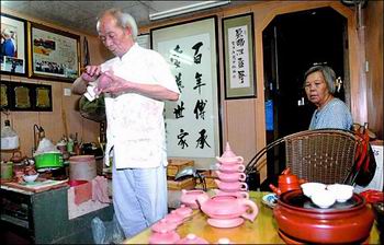 73歲陶瓷藝術(shù)大師吳瑞深(左)技藝精湛,他創(chuàng)作的潮州手拉朱泥壺得到國內(nèi)外客商的青睞,也使更多的人領(lǐng)略到潮州陶瓷的深厚底蘊(yùn)。