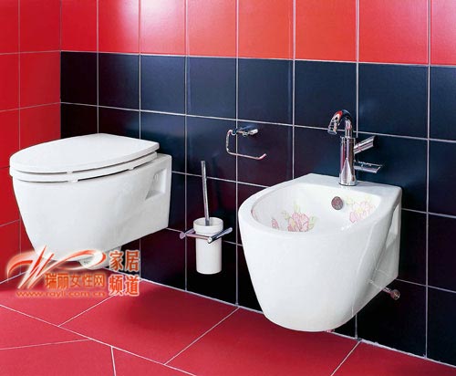 內(nèi)壁帶有花案的潔具十分漂亮,但由于潔具本身是白色的,不宜將它們安置在素白色調(diào)的環(huán)境里,紅色墻磚環(huán)繞黑色墻磚背景墻卻能將內(nèi)壁上的花案襯托得更醒目。