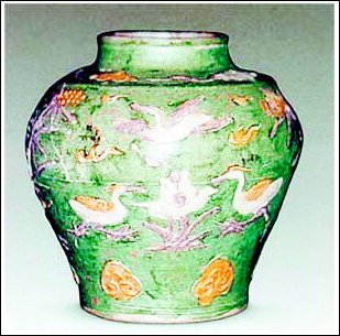 泰州博物館藏有一件從明代墓葬中出土的素三彩堆塑雁紋瓷罐,這件三彩罐高15.1厘米,口徑7.l厘米,底徑9.2厘米,唇口微外翻,短直頸,鼓腹,下腹?jié)u收,近底處稍外撇,平底,細(xì)白胎,腹部有一圈胎接痕,最大半徑偏于上部,顯得圓潤(rùn)豐滿。罐內(nèi)部施白釉,外部滿刷草綠色釉,罐身堆塑黃、紫、白三色釉裝飾的蘆雁、云彩、蓮花等圖案。從造型、胎接工藝及紋飾分析,應(yīng)為明代中晚期景德鎮(zhèn)的產(chǎn)品。