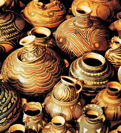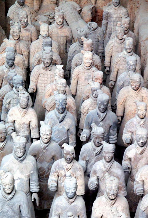 陶經過了從灰陶、黑陶、白陶到印紋硬陶、彩陶的發(fā)展變化之路,在陶器的造型上也經歷了由簡單到復雜、由粗放到精細、由平淡到生動的漸進過程。早期陶最負盛名的作品之一是出土于陜西臨潼秦始皇陵陪葬坑的兵馬俑,也叫秦俑。秦俑位于陜西臨潼附近,是秦始皇陵的一部分。自1974年開始,迄今已發(fā)掘了呈品字排列的三個俑坑,出土了真人大小的兵馬俑6000余個,其中有活馬大小的陶馬30余匹,戰(zhàn)車100余乘,組成了規(guī)模宏大的秦俑博物館。一號坑規(guī)模最大,長230米,寬62米,深5米,面積達14260平方米,是主力步兵戰(zhàn)陣,排列著一個一個整齊威武的軍隊方陣,間有雄健高大的戰(zhàn)馬。陶俑有士兵、馭手、鎧甲軍士、軍官、將軍,姿勢有立姿、跪射姿。二號坑略小,是騎兵戰(zhàn)陣,有戰(zhàn)車上千輛。三號坑最小,僅有六七十個軍官和將軍俑,似為指揮部。這些兵馬俑做工極其精良,須發(fā)畢現,面部表情生動,姿態(tài)自然,衣紋流暢,顯示出嚴肅剛強、器宇軒昂的神態(tài),戰(zhàn)馬也敦實有力、蓄勢待發(fā)。這形象地證明了當時中國陶瓷技術達到了何等卓越的水平!這是一支為秦始皇死后護衛(wèi)的冥軍,為了建造它,老百姓付出了慘痛的代價,但是也為我們留下了這舉世矚目的珍寶,被譽為“世界第八大奇跡”!現任法國總統(tǒng)、當時的總理希拉克說:“不見金字塔,就不算到過埃及;不見兵馬俑,就不算到過中國!”