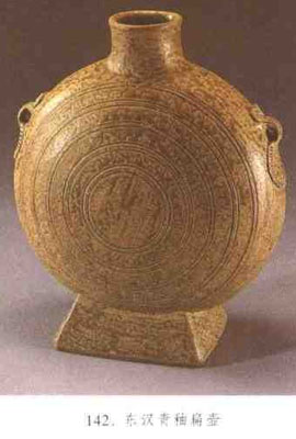 壺式之—,特征是壺身扁平,肩腹部有系,便于穿繩提攜。瓷質(zhì)帶系扁壺出現(xiàn)于東漢時(shí)期,是仿銅器形狀制作的。1986年浙江余杭反由出土的東漢青釉扁壺,為圓唇口,直頸,扁腹,長(zhǎng)方形足外撇,上腹兩側(cè)有對(duì)稱的銜環(huán)耳。西晉時(shí)壺體呈豐唇,直口,短頸,圓肩,肩部?jī)蓚?cè)各貼塑帶翼鼠為系,壺腹扁圓,圈足為橢圓狀。南北朝、唐、五代時(shí)期出現(xiàn)了一種帶西域風(fēng)格的扁壺。如1971年河南安陽(yáng)北齊武平六年(575年)范粹墓出土黃釉瓷扁壺,敞口,短頸,肩兩側(cè)各有一帶孔凸起為系。壺體扁圓,上窄下寬似核桃狀,底部假圈足,扁腹兩面印有胡人舞蹈圖案。與此相似的扁壺還有唐三彩制品,所不同的僅是紋飾上的變化。遼寧省博物館收藏遼暗黃釉印花穿帶扁壺則帶有北方游牧民族的特征,長(zhǎng)方形口,短頸,扁圓形壺體,橢圓形圈足,周邊有凹溝,共有6個(gè)系。與之相似的扁壺,在內(nèi)蒙古和林格爾晚唐墓中也有發(fā)現(xiàn)。收藏于寧夏海原縣文化館的褐釉扁壺、蘑菇形口,短粗頸,壺體扁圓,周圍有四系。元代四系扁壺,唇口外卷,短頸,溜肩、裝有四系、腹側(cè)垂直,腹面平,長(zhǎng)條狀平底,造型風(fēng)格與前朝完全不同,燒造地點(diǎn)有景德鎮(zhèn)窯、龍泉窯、磁州窯。綜上所述可以看出,帶系扁壺名稱相同,然而由于歷史時(shí)代不同,形狀各有差異,各個(gè)時(shí)期都反映了濃厚的時(shí)代特征。(見圖142)