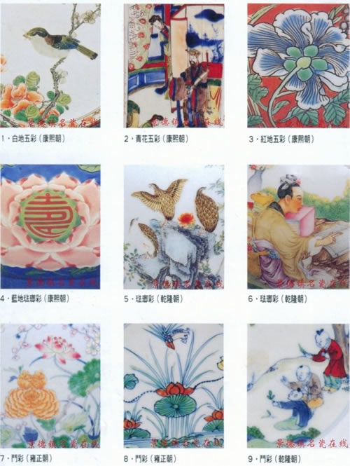 紅:有祭紅、虹豆紅、寶石紅、郎窯紅、抹紅、珊珊紅、胭脂紅、粉紅、海棠紅、束紅、磯紅、肉紅、鮮紅、朱紅、大紅、柿紅、娃娃臉等。
