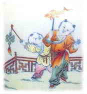 嬰戲紋 所謂嬰戲,即以嬰兒為畫面的主角,描寫兒童釣魚、玩鳥,蹴球、趕鴨、放鵪鶉、抽陀螺、攀樹折花等種種活動(dòng),著墨不多而情趣盎然。