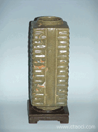 北宋至明初,龍泉青瓷經(jīng)歷數(shù)個(gè)世紀(jì)盛衰歷程,窯場(chǎng)主要分布于浙南山區(qū)。玉琮是古代重要禮玉,《周禮》:“以黃琮禮地。”宋龍泉青釉琮式瓶是古玉琮文化藝術(shù)的衍生。瓶高26.8厘米,滿施青釉,蘊(yùn)古玉之靈,渲陶瓷之華,瀉鴻儒之志。宋人以龍泉青釉之潔瑩致縝,嬗化古玉之靜穆恬雅,恰是華夏先賢“我思古人,實(shí)獲我心”思想的物質(zhì)傳承。