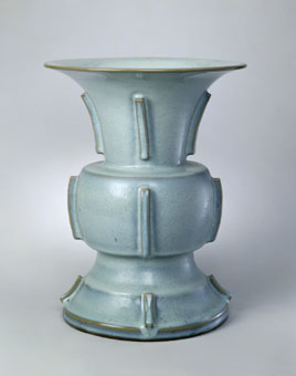 鈞窯月白釉出戟尊,宋,高32.6cm,口徑26cm,足徑21cm。