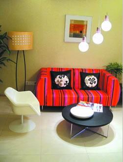 。蹠(huì)客區(qū)]這里的每一樣家具和擺設(shè)都是家具店里最常見的,可是,當(dāng)他們安靜的靠在一起,就成了這首曲子最完美的部分。紅赫條紋布藝沙發(fā)帶有女人的嬌艷和男人的內(nèi)斂,張揚(yáng)中舒緩著沉穩(wěn)。永恒的黑白配似乎也成了線譜上的音符,白的擔(dān)任靠椅,黑的圓形小茶幾,視覺對(duì)比的沖撞中帶出了旋律般的美感。在固有在美麗中,是沙發(fā)后探出頭來的綠意賦予了樂曲生命,生活的氣息,就在這不經(jīng)意的目光所及中彌漫。
