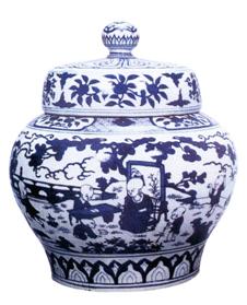 明代前就已設(shè)立御窯廠,洪武二年政府就規(guī)定“祭器皆用瓷”。在對外入貢國的答贈中,也需要大量瓷器,洪武七年就一次性賜贈琉球瓷器七萬件?梢姰敃r的瓷器生產(chǎn)量如此之大。洪武時期,青花色調(diào)略發(fā)灰,呈淡青色,主要是用的國產(chǎn)青花釉料,部分是元代留下的進口青花釉料。1964年南京故宮出土的瓷器中,有一部分是洪武時期的制品。其中有一件官窯青花云龍紋盤,外壁繪青花云龍,里壁模印,盤心畫如意云三朵?傊髑嗷ù杀仍嗷ǜ邪l(fā)展,在產(chǎn)量和質(zhì)量方面都突破元代。永樂、宣德時期經(jīng)過三十多年的發(fā)展,青花瓷已達到又一高,這一時期的青花瓷,胎骨堅、釉精細、青花濃 艷、造型多樣和花紋優(yōu)美而負盛名,被世人稱我國青花瓷器的黃金時代。永、宣時期采用的青花料有三種:一是進口釉料,色澤鮮艷,帶有黑色鐵銹斑點,產(chǎn)地來自南洋的“蘇泥勃青”,據(jù)說是由鄭和出洋帶回來的鈷土礦,含氧化鐵較多。二是國產(chǎn)料,青花較深為藍色,比較柔和,多用于民窯產(chǎn)品。三是進口料和國產(chǎn)料混合使用,各取所長,進口料容易暈散、流淌,多用于寫意畫面,比如繪畫庭院嬰戲,畫庭院用進口青花料、畫人物用國產(chǎn)青花料,這樣巧妙結(jié)合層次分明,藝術(shù)效果較好。這個時期青花瓷器的鐵銹斑,永樂時期出現(xiàn)多,宣德時期比較少。永、宣時期的青花大盤較多,繪畫內(nèi)容常見的有纏枝花卉、一束蓮、多為砂底,有小點火石紅斑。這時期也生產(chǎn)一些其它器如永樂年制造壓手杯,中心畫雙獅滾球,還有玉壺春瓶、梅瓶、貫耳瓶、高足碗、蓋碗等青花器。