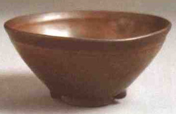 宋代福建建窯生產帶兔毫斑紋的黑釉茶盞。宋、元時期福建其他地區(qū)也燒這類瓷盞,但均不如建窯產品精巧。建窯兔毫盞北宋時始燒,南宋時最為繁盛。元代不再生產。兔毫盞是宋代建窯的特殊產品,造型為口微斂,斜壁較深,小圈足。外釉不到底,足部露鐵銹色胎,黑色釉面上流淌出絲絲兔毫般的紋理。兔毫紋的形成機理與胎質和釉質有關。其胎是由燒成溫度偏低的瓷土制成,主要成分二氧化硅和氧化鐵的含量高,三氧化二鋁含量稍低。其釉中氧化硅與三氧化二鋁含量比值比其他黑釉比值偏小,三氧化二鐵和氧化鐵含量偏高。因此,在高溫燒制過程中,受熱產生的氣泡將熔入釉中的鐵微粒帶至釉面,當溫度達1300℃以上釉層流動時,富含鐵質的部分流成條紋,冷卻時從中析出赤鐵礦小晶體,于是形成了細長似兔毫的紋理。兔毫釉從外觀上可以細分為金兔毫釉、銀兔毫釉、灰兔毫釉、黃兔毫釉,也有純黑釉。各種兔毫釉的形成都是由于在燒制過程中,釉受熱產生液相分離,分離的液相析出氧化鐵結晶所致,與燒成氣氛和冷卻制度有關。兔毫盞名揚天下,完全借助于宋代的飲茶之風。從皇帝到士大夫階層的飲茶論著中,都以此為點茶、斗茶的首選茶盞。宋代詩文中也大加贊美,有“松風鳴雪兔毫斑”、“兔褐甌心雪作泓”之句。由于皇室對兔毫盞的偏愛,北宋后期建窯一度專為宮廷燒制茶盞,更使建窯地位顯赫。參見“黑建”。(見下圖)