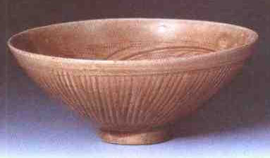 南宋至元初福建南部沿海地區(qū)瓷窯生產(chǎn)的一種青瓷。特征是質(zhì)地比較租厚,青灰胎,青釉較薄,玻璃質(zhì)強(qiáng),釉色多數(shù)泛黃,有的淺淡,有的較深,有的泛褐色。碗、盤類器物內(nèi)壁滿釉,外壁只在中腹以上部位施釉。各類器物都在內(nèi)壁用刻花、劃花和錐刺手法作出犀利而流暢的水波游魚、卷枝蔓草或朵云流水等紋飾,間以篦齒狀上具錐刺出的篦劃紋,內(nèi)戳出篦點(diǎn)紋。器物外壁刻傘骨狀復(fù)線紋。考古工作者最早在福建同安汀溪窯發(fā)現(xiàn)這類青瓷。故稱為同安窯青瓷,也有的根據(jù)花紋特點(diǎn)稱為劃花篦點(diǎn)紋青瓷,因15世紀(jì)日本茶道始祖村田珠光法師喜用此類茶碗,故日本學(xué)者稱之為珠光青瓷。生產(chǎn)這類青瓷的窯址在閩南地區(qū)還有泉州窯、連江窯、南安窯、安溪窯、廈門垅子尾窯等。近年在廣東番禺的奇石窯也有發(fā)現(xiàn)。宋元時(shí)代是我國(guó)海外貿(mào)易蓬勃發(fā)展的時(shí)期,瓷器大量輸出。閩南有泉州、同安等優(yōu)良海外貿(mào)易港口,是古代瓷器輸出的重要基地,珠光青瓷由此大量輸出到海外,在東南亞、日本、朝鮮等國(guó)家和地區(qū)均有發(fā)現(xiàn)。(見下圖)