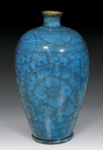 “孔雀藍釉”屬于西亞地區(qū)的傳統(tǒng)釉色,其制品在唐宋期間的商貿往來時被帶到中原并在金、元民窯中陸續(xù)制作。大同金代閻德源墓出土的一對孔雀藍黑花玉壺春瓶是我國較早期的孔雀藍制品。從金、元產(chǎn)品工藝看,13世紀的磁州窯系翠藍器(圖4-1)水平相對較高,至今有不少繪畫精美的“翠藍黑花”器存世。(編者注:隨著桂林明靖江王陵墓群出土孔雀藍黑花梅瓶實物面世,結合器形演變,以往定為元代的一些孔雀藍黑花器被現(xiàn)今研究界明確定為明代產(chǎn)品。)需要特別指出,有關學者根據(jù)科學成分分析發(fā)現(xiàn)該類制品使用低溫石灰釉,與我國傳統(tǒng)上以氧化鉛為助融劑的低溫釉配方并不一致,因此推斷該類色釉極可能是引進西亞地區(qū)的原始配方,這也解釋了孔雀藍釉的原始起源問題。