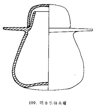流行于明、清的一種罐式。明永樂(lè)時(shí)期創(chuàng)燒,因罐體似卷軸畫的軸頭而得名。造型為上小下大,斜直腹,圈底內(nèi)凹,頸、腹之間有板沿,弧形帽式蓋。清康熙、雍正朝多有仿制。(見(jiàn)圖109)