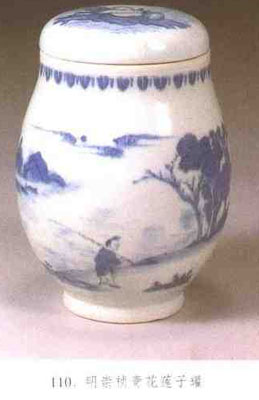 流行于明崇禎朝的一種罐式。直口,垂肩、長圓形鼓腹,圈足、附蓋、蓋面略鼓、整體造型似一顆蓮子。(見圖110)