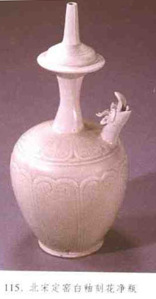 佛教憎侶“十八物“之一,游方時可隨身攜帶以貯水或凈手。它淵源于佛國印度,后隨佛教傳入中國、日本、朝鮮及南洋群島諸國。梵語音為“捃雅迦”、“君遲”、“軍持”,中譯為瓶或澡瓶。瓷質(zhì)凈瓶流行于唐、宋、遼時期。造型為管狀細長頸,頸中部凸出如圓盤,長圓腹,圈足,肩部上翹的短流多作瑞獸首形。元、明以后多稱“軍持”。器身多扁圓,頸較短,流肥碩。入清以后,這—器形為皇家壟斷,演變?yōu)橹鳖i,豐肩.斂腹,高圈足外撇如蓋展開,無流,成為清朝廷賜給西藏高級僧侶插草供佛之物、故又改稱“藏草壺”。(見圖115)