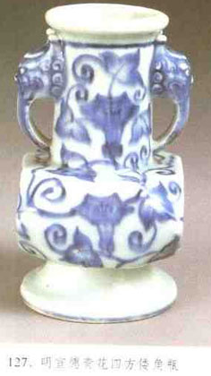 瓶式之一,是明宣德時期景德鎮(zhèn)御器廠創(chuàng)制的新器形。形狀為唇式口微侈,直頸兩側(cè)貼塑曾耳,方形腹的每個直角均斜削45度,使之變?yōu)榘死忮N形,圈足外撇。清雍正御窯廠仿品造型與宣德器相比,瓶體較大,且書有雍正官窯款。乾隆朝仿品底足較矮,獸耳小。明末清初時無款仿品有的可達(dá)亂真程度。(見圖127)