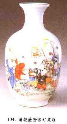 瓶式之一。因形似長圓形燈籠而得名。流行于清雍正、乾隆時(shí)期,造型為直口,短頸,豐肩,筒腹,圈足。 (見圖134)
