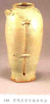 唐至五代時期流行的壺式之一。整體作并聯(lián)的雙魚形,雙魚嘴為壺口,魚體作壺身,魚尾為假圈足。魚背脊間各有凹槽,槽上下兩端貼有橋形系,可系繩.故又名雙魚穿帶壺。陶、瓷質雙魚壺是受金銀器影響后出現(xiàn)的新品種。唐代越窯青瓷和三彩陶制品較多。1983年廣東梅縣出土唐代水車窯青釉雙魚壺,壺口外敞,魚形腹,圈足仿魚尾,肩部一側裝管形短流,雙魚之間有一凹槽、上下各設一系,足上部有穿孔,制作簡練。1964年河北井陘縣出土五代時期的白釉雙魚穿帶壺,雖然雙魚的基本特征均有細致的刻畫,但與唐代相比、缺少了簡練、生動的效果。(見圖148)