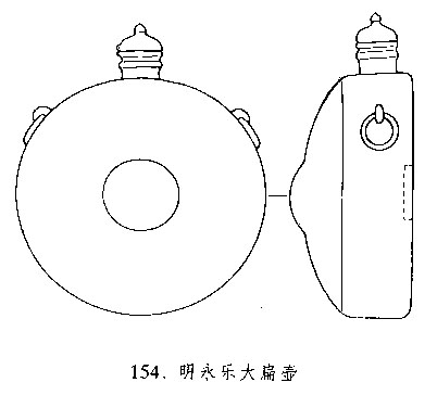 壺式之一。明永樂時期創(chuàng)燒、小直口、頸部凸起一棱,并有一小系,有蓋。壺身為立扁圓形,正面微鼓,中心有圓形凸臍;背面平坦、中有相應(yīng)的圓形凹臍。底部為弧面。左右肩部各有—活環(huán)系。均為青花制品。正面凸臍上多繪八角星紋。外圍有的繪纏枝蓮,邊緣為海水紋,側(cè)壁一周繪纏枝蓮紋。背面無紋飾。器形仿西亞金屬器皿.其用途有待考證。(見圖154)