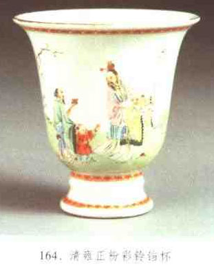 亦稱仰鐘杯、金鐘杯、磬式杯、杯式之一,流行于明、清時期。杯口外撇、深腹、圈足,倒置似鈴鐺。明成化、嘉靖、萬歷時鈴鐺杯有白釉、斗彩、青花等品種。清康熙、雍正時則有青花、五彩等。(見圖164)