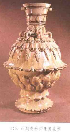 南北朝時(shí)期的一種青瓷尊,是順應(yīng)佛教盛行而產(chǎn)生的器形。造型呈侈口、長頸、溜肩、鼓腹、外撇高圈足,肩部均勻分布6個(gè)直系。器身布滿堆塑的上覆下仰層層蓮花瓣、蓮瓣豐碩而高凸,其間還貼塑飛天與寶珠紋。全器造型宏偉,裝飾瑰麗,藝術(shù)水平相當(dāng)高。(見圖170)