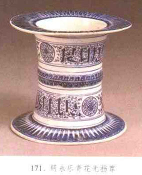 尊式之—,流行于明永樂、宣德時期。平沿,圓口、筒腹上下通透,底沿扁平與平沿呼應(yīng)。器形明顯帶有異域風(fēng)格、亦有人稱之為器座。清康熙、雍正、乾隆三代均有仿品。(見圖171)