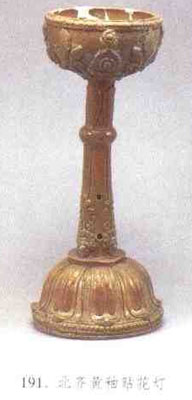 照明器具;緲(gòu)成由燈柱、油盞和承盤3部分組成。東漢冥器有灰陶、釉陶制品。除單只燈形外,還有的燈柱上端托圓盤,盤內(nèi)立有張開雙翼的瑞鳥、燈柱四周有“S”形枝蔓,枝蔓根部貼有葉形紋,頂端托油盤。1958年出土于南京清涼山吳墓的青瓷熊燈、燈柱做成熊形,蹲坐在承盤內(nèi),頭頂和前肢托著油盞、承盤底刻有“甘露元年五月造”銘文。西晉時燈柱有熊形、人形,柱比三國時高一些。東晉南朝以后的油燈造型趨于簡樸,燈柱更加細(xì)長。唐代的無柱盞式油燈,移動比較方便。唐代四川邛窯生產(chǎn)的省油燈,構(gòu)思巧妙。明宣德時有壺式油燈、圓腹、高足、直流、壺帶蓋、立于承盤內(nèi)。曲柄上端與壺的肩部相接、下端與承盤相聯(lián)、燈芯從壺嘴內(nèi)伸出、壺腹部可貯油。(見圖191)