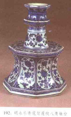 插置蠟燭的照明器具。三國(guó)時(shí)期有青瓷臥羊形燭臺(tái)。西晉流行臥獅形燭臺(tái)。南朝時(shí)燭臺(tái)形式較多、有獅形、單管、雙管、四管、荷花形等,其中管狀燭臺(tái)在福建地區(qū)流行,上有弦紋長(zhǎng)柄,柄上端是敞口碗形,碗中有燭座。明永樂、宣德時(shí)景德鎮(zhèn)窯燒制的燭臺(tái),器口和臺(tái)座呈八角形,頸部為圓柱形。北京故宮博物院藏明正德官窯款青花阿拉伯文燭臺(tái),為一管狀圓柱立于高臺(tái)盤。清代以后的燭臺(tái)形制基本承襲此式。(見圖192)