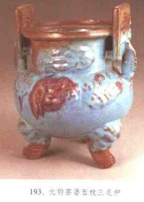陶瓷焚香用具。也可作陳設(shè)之用。陶爐流行于漢,多為冥器。瓷爐始于三國(guó),多為香熏。五代、宋始流行三足爐,造型摹仿古代青銅器,多用于陳設(shè)或焚香。器形有鬲式、魚(yú)耳、鼓釘、蓮瓣、三足、五足、弦紋爐以及熏爐等多種式樣。(見(jiàn)圖193)