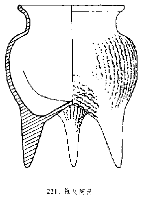 陶器足部形式之一,為上端粗大下端尖細(xì)的實(shí)體,形似錐體。陶爵和馬家浜文化陶鼎的三足即為錐形足。(見圖221)