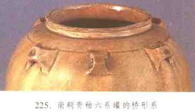 陶瓷器系的—種形式,造型似拱橋,外側(cè)為梯形,中有圓孔。流行于六朝青瓷罐、壺等器物上,有的器物橋形系與環(huán)形系并存。(見圖225)