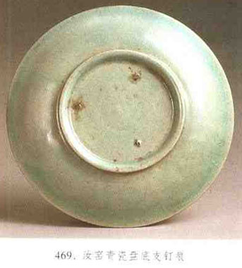 用支釘為間隔具裝燒的陶瓷器釉面上留下的釘尖痕跡。支釘痕如果大或深,會(huì)嚴(yán)重影響產(chǎn)品的外觀質(zhì)量。因此,工匠們盡可能將釘尖部做小。北宋汝窯燒制的宮廷用瓷支釘細(xì)小,釉面上留下的支釘痕小如芝麻粒,被稱為“芝麻掙釘”。(見(jiàn)圖469)