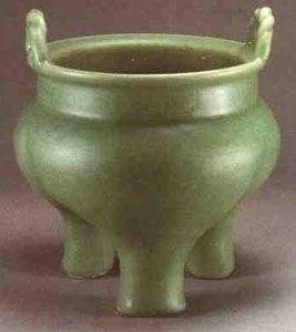 明代(1368~1644年)浙江龍泉窯燒制的青瓷。明代龍泉青瓷與宋元時期相比,無論產(chǎn)量還是質(zhì)量,均已大為遜色,呈衰退之勢。器構造型有高足碗、瓶、爐、壺等、普遍特點是胎體厚重,釉色透明度較高、成型草率,質(zhì)量粗糙。但是也有部分質(zhì)量較高的器物,如大盤和大花瓶等,造型規(guī)整,形體碩大,釉色青綠,刻花精美。明代龍泉青瓷的裝飾方法主要是刻劃花和印花,裝飾題材主要有山水人物和歷史故事等,還常見有“金玉滿堂”、“長命富貴”、“福如東海”等吉祥語。(見下圖)