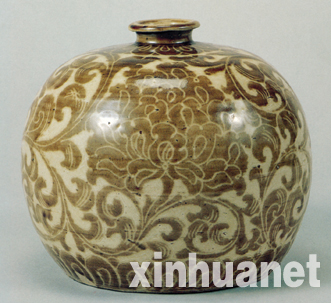 白地褐花牡丹紋瓶,高17.3厘米。日本重要文化財,北宋定窯產(chǎn)品。瓶小口微敞,頸部極短,圓肩圓腹,大平底。此種造型俗稱"吐嚕瓶",與后代的太白尊極為相似,應是后者的濫觴。宋代定窯除生產(chǎn)白釉器外,還生產(chǎn)有黑釉、醬釉、綠釉及白地褐花(即鐵銹花)等品種。此器的裝飾手法應為剔花,即在器表施上褐色釉料,待釉料半干時,將花紋部分或紋樣以外的釉層剔去,露出胎體,施釉燒成后釉色與胎地形成對比,花紋具有淺浮雕的裝飾效果。剔花裝飾技法始于磁州窯,后陸續(xù)被其他窯場采用。
