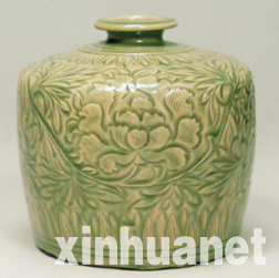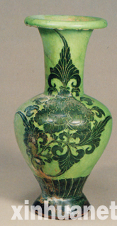 綠釉黑花牡丹紋瓶,高35厘米,宋代磁州窯系產(chǎn)品。日本重要文化財。此瓶造型優(yōu)美,口沿向外翻卷,形似一朵盛開的大喇叭花,修長的頸部至肩部微微內(nèi)收,圓潤的斜肩,肩以下向內(nèi)急收至底部又向外撇,形成一個喇叭形底足,瓶的最大徑位于肩腹交界處。整個形體似一曲跌宕起伏的樂曲,富有節(jié)奏與韻律美。紋樣的布局也別出心裁,將一片花葉布置在頸部,頗具新意。瓶的胎土雖不甚細白,但使用了化妝土裝飾工藝,這也是磁州窯系常常運用的方法,以遮蓋胎土的缺陷,使釉面顯得亮麗勻凈,色彩對比分明。綠釉黑花是瓷器釉下彩品種之一,是在燒成的白底黑花器上罩一層綠釉,再經(jīng)低溫燒成。此器顯然是在用黑彩繪畫后,又用尖狀工具勾劃出紋樣的輪廓線及花筋葉脈,再罩上綠釉。