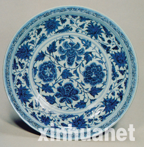 青花牡丹紋盤,元代景德鎮(zhèn)窯產(chǎn)品。這是一件私人捐贈的藏品,也被指定為日本重要文化財。此盤折沿,器形碩大,口徑達44.5厘米。裝飾有圖案式紋樣,分為三層,盤內(nèi)底中央飾四朵不同樣式的卷枝牡丹花,盤壁是二方連續(xù)纏枝番蓮,口沿飾細線卷云紋,各層花紋之間以兩組細雙線弦紋相間。盤外壁與內(nèi)壁的花紋相同。青花料顯然使用了進口的波斯鈷料,這種鈷料含錳量少,含鐵量高,且含鉀,青花色澤濃艷幽靚。這件青花盤恰到好處地運用了此種鈷料有深色結(jié)晶斑塊的特點,形成了花朵濃淡有別的立體感和透視效果。底足內(nèi)無釉,可看出胎質(zhì)細白堅致,圈足非常規(guī)整,這似乎與元青花修坯不夠精細的特點相悖,是元代景德鎮(zhèn)青花瓷器中的一件精美之作。