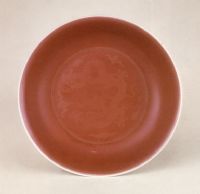 說 明: 通體施紅釉,金彩雖已剝落,紋飾仍依稀可辨.口沿為燈草邊.足內(nèi)施青白釉.