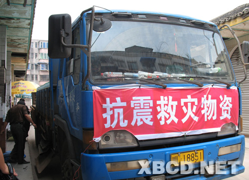 5月16日,四川科達(dá)陶瓷有限公司捐贈的2萬元救災(zāi)物資從夾江出發(fā),運(yùn)往地震中受災(zāi)的綿陽市安縣。這批物資包括礦泉水、手套、口罩、帳篷等災(zāi)區(qū)急需用品。(完)(趙剛 楊曦)