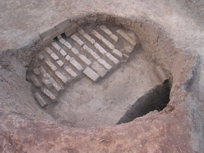 此次發(fā)掘窯址共3處,均為馬蹄形磚窯,其中1號磚窯保存基本完整。該窯東西朝向,磚窯總長約10.3米,分窯室、火膛、火道、火門、操作間等。窯室略為圓桶狀,上口稍大,東西直徑約4.36米,高為2.8米。窯室內(nèi)壁設(shè)煙道3處、壁龕1處;鹛拧⒒鸬篱L約3.35米,平面呈喇叭形;痖T殘寬80厘米、高80厘米。操作間呈楔狀,殘長3.9米、寬2米。經(jīng)發(fā)掘,窯內(nèi)出土部分城墻磚,每塊磚長40.8厘米、寬20.2厘米、厚11.7厘米。同時,還出土明代青花瓷片、青瓷盤、陶罐等遺物。