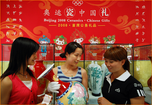 奧運臨近,奧運題材的高檔工藝品銷路看好。筆者近日在國際商貿(mào)城旅游購物中心看到,一些價值數(shù)萬元的極品瓷器,吸引了眾多客商的目光。據(jù)一家商店的負責(zé)人介紹,隨著北京奧運的臨近,收藏珍品級奧運題材工藝品的大有人在,不但有我市的投資收藏愛好者,也有國外的一些客商。圖為商家負責(zé)人在向客人展示“描金極品中國紅奧運瓷”。