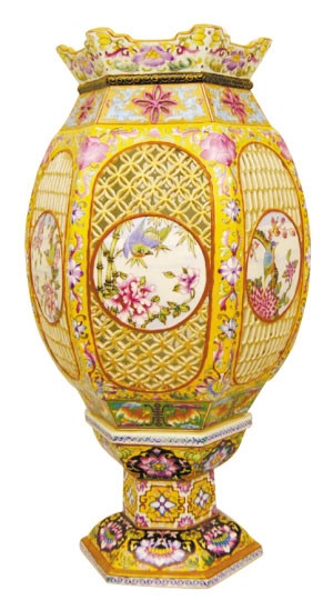 雍正御制八棱琺瑯彩瓷燈臺,燈罩為鏤空瓷刻。與故宮現(xiàn)存的乾隆粉彩鏤空開光花卉燈罩(無燈座)相比,此器完整無缺,并揭開了燈座的百年之謎。