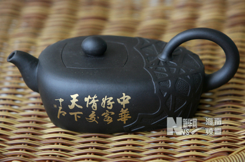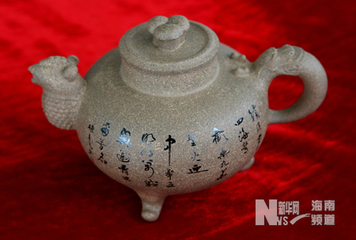 這是一把帶有“火炬”和書法作品的紫砂壺(7月12日攝)。新華社記者 李明放 攝