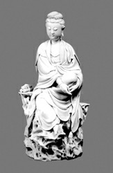 這是一尊觀音女相(見圖),觀音頭挽高髻,面部豐滿圓潤,體態(tài)豐腴,頸戴項圈,手戴鐲,兩手相交,置于左膝下。上著廣袖褒衣,下穿寬管長褲,赤足。她正悠閑地靜坐在山石上。她的雙目瞇縫,含蓄端莊,溫順雅靜。從她的造型中,令人感受到觀音泰然自若,成竹在胸的穩(wěn)重神態(tài),給人以力量、信賴和希望,這同樣是基于觀音菩薩慈悲為本的要求塑造的。瓷塑的胎質(zhì)白而細(xì)膩,表面施上白釉,色如象牙,背面有“何朝宗”方款。這件造型優(yōu)美、工藝精湛的觀音像,是明代晚期福建德化窯的上品。作者以嫻熟的手法,把整座瓷像塑造得神完形備,栩栩如生,把外觀形象美,內(nèi)在氣質(zhì)美、工藝技法美有機地融于一體,達(dá)到了思想意蘊與美術(shù)效果的高度和諧統(tǒng)一。