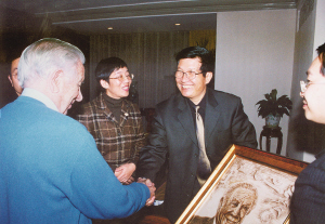 | 國際奧委會名譽主席薩馬蘭奇(左一)在北京接見了工藝美術(shù)大師金全才,并接受了贈送的瓷刻肖像。 (資料圖片) |